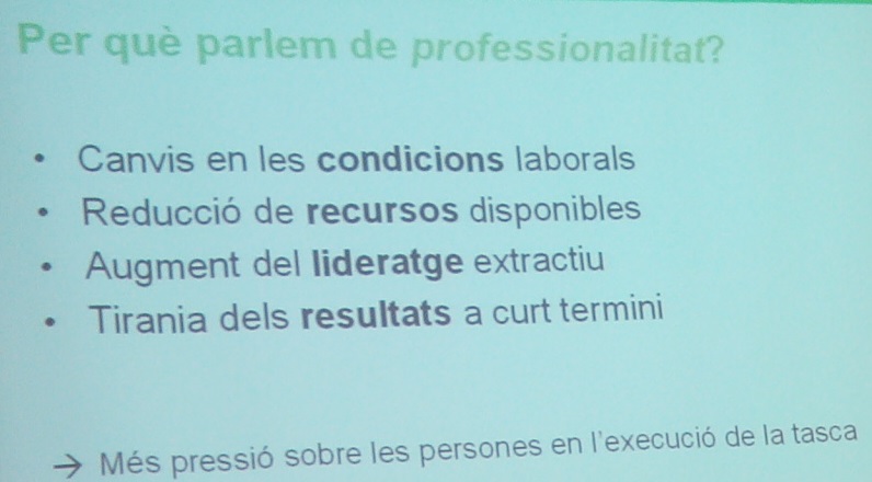 Bajo la dirección del consultor Albert Rimbau se había trabajado con un pequeño grupo de personas voluntarias dedicándose a reflexionar sobre las nuevas vicisitudes de su trabajo y cómo se pone a prueba su profesionalidad debido a las nuevas exigencias del cumplimiento laboral en esta etapa. O lo que es lo mismo: una percibida mayor presión de trabajo, con menos medios para desarrollarla.