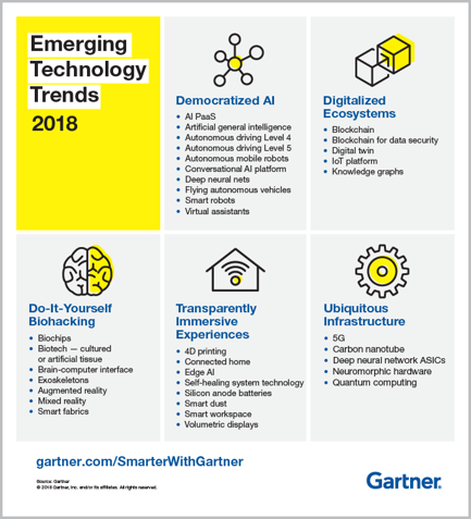 Pero eso no es todo, en la infografía que recojo de la consultora Gartner, se resumen cinco grandes tendencias de 2018 para los próximos años. Entre ellas, la explosión de la inteligencia artificial, todo lo relacionado con la biomedicina y la genética, los ecosistemas digitalizados y las experiencias inmersivas. En fin, un panorama de aceleración absoluta en el que ya nos hemos acostumbrado a vivir y nos sorprende menos.