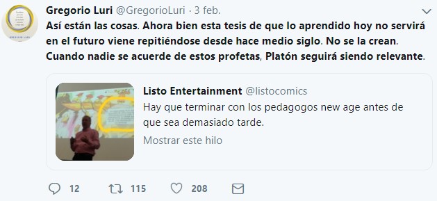 Gregorio Luri, creo que con un afan un pelín provocador, y siendo una de las personas que con más profundidad está trabajando los temas pedagógicos ( y otros muchos), se permitió el lujo de ir a contracorriente y criticar el afán desmedido que se ha instalado en dictaminar -quizás con poca base empírica, que los contenidos, en la era de la hiperinformación han de ocupar una posición secundaria.