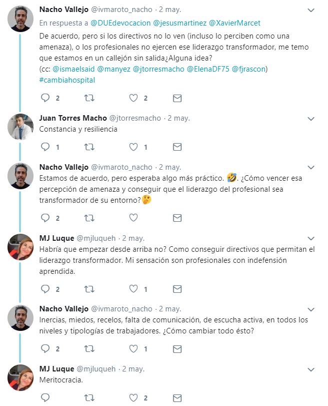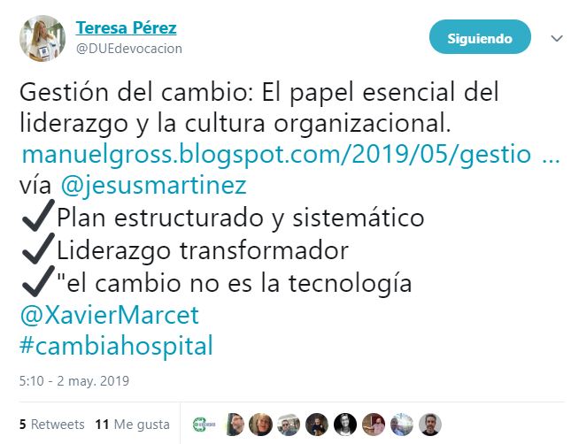 Pequeñas sorpresas, como suele decirse, te da la vida. Esta semana, vía el blog Pensamiento Administrativo, del curador chileno Manuel Gross, el cual republica el post de mi blog Los esenciales del cambio organizativo, se genera en twitter un debate por parte de profesionales del entorno sanitario.