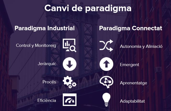 Manel Heredero siempre atento a lo más actual en la colaboración a nivel internacional, volvió a recordarnos algo que en determinadas organizaciones, aun teniéndolo claro a nivel teórico, en la práctica no lo aplicamos: pasar del paradigma industrial al paradigma conectado. En la imagen se refleja. Nos sirve para recordarnos permanentemente que nuestras mochilas cognitivas,  en las que fuimos socializados y empezamos a trabajar, a veces no son nada más que grandes barreras que nos impiden apostar por las nuevas estrategias.