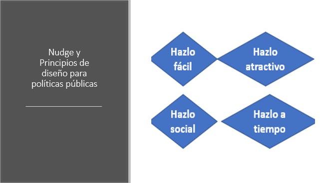 El valor del artículo de Sara García radica en la simplicidad con la que presenta la herramienta. Agrupa todas las intervenciones que hasta ahora se han desarrollado en cuatro principios de diseño que adapta del Behavioral Insights Team/BIT [1] : hazlo fácil, hazlo atractivo, hazlo social y hazlo a tiempo.