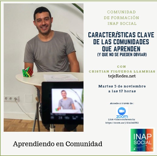 Y, también, como no, tendréis la posibilidad de conocer al próximo ponente invitado en el espacio Aprender en Comunidad, una serie de webinars que el pasado octubre inauguramos con la presencia de Carlos Gómez. En esta ocasión se trata de Cristian Figueroa, uno de los mejores expertos en comunidades y en la nueva interacción organizacional. Su ponencia se titula: Características clave de las comunidades que aprenden: aquello que no se puede obviar. Será el próximo 5 de noviembre, a las 5 de la tarde. Podrá seguirse en este enlace. La estructura, os recuerdo, serán 30 minutos de exposición y 30 minutos de preguntas. ( Nota: para conectarte se te solicitará permiso para bajarte la aplicación (zoom) (Abriremos, en breve, un nuevo debate en el espacio comunidad Formación para empezar a plantearle preguntas a Cristian y conocer más en profundidad su trabajo.