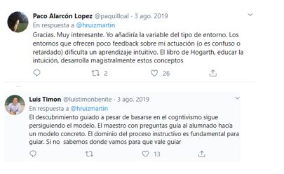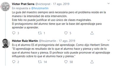 La buena noticia es que las decisiones basadas en pedagogía tienen gran recorrido. A la hora de plantear la introducción de nuevas modalidades de aprendizaje, o de reforzar y crear nuevas figuras, es fundamental tener en cuenta la evidencia de aquello que se ha mostrado eficaz. Por poner un ejemplo reciente, copio a continuación una conversación en Twitter en la que se debaten muchas de las preocupaciones que ahora tenemos a la hora de introducir nuevos mediadores que complementen/sustituyan al formador tradicional. Os aconsejo leer el hilo entero de Héctor Ruiz Martin.