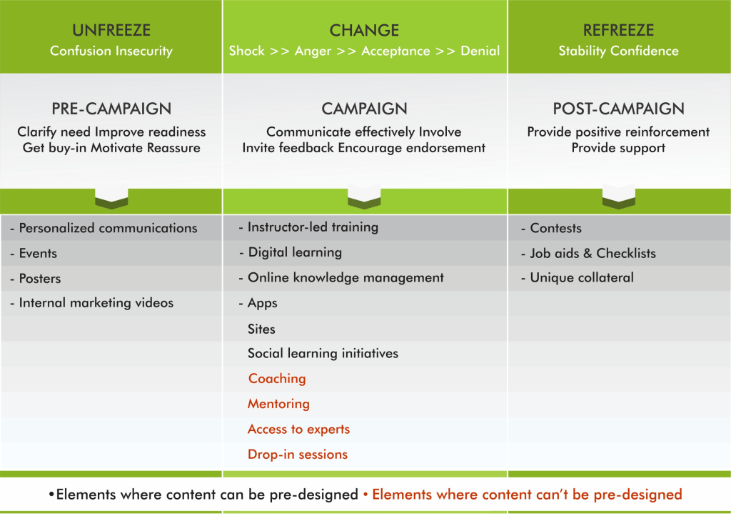 Lo presenta con este esquema en tres pasos con acciones concretas (combinados con la gestión del cambio):