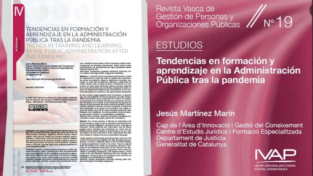 Aprovecho para referenciar en el blog (no lo había hecho antes), el artículo publicado en enero en la Revista Vasca de Gestión de Personas y Administraciones Públicas donde expongo el nuevo contexto del aprendizaje tras la pandemia. Fueron 27 páginas febriles al hilo de los acontecimientos que estábamos viviendo desde la primera línea.